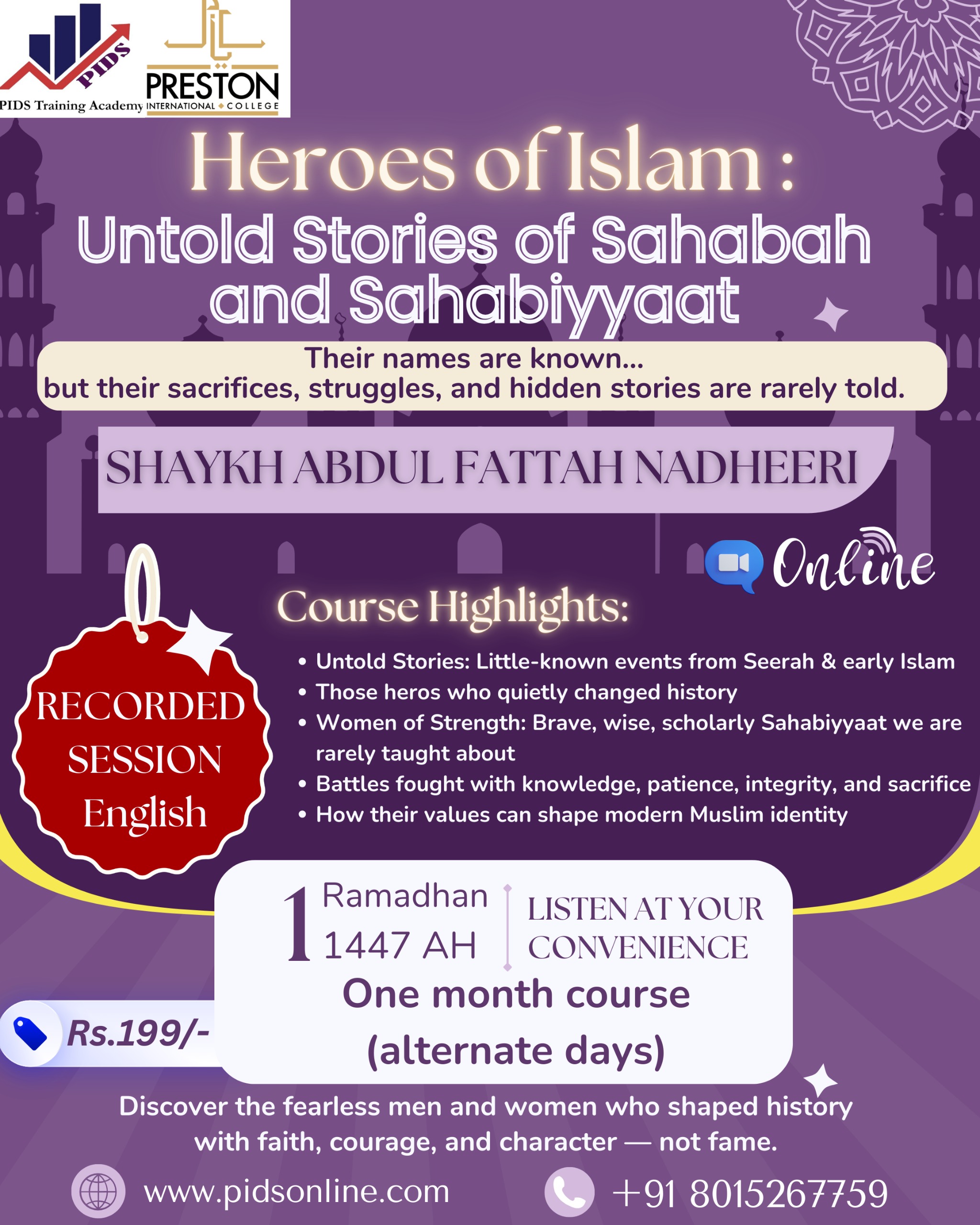 Join this online recorded course in English and discover the fearless men and women who shaped Islamic history—not through fame, but through faith, courage, knowledge, and integrity.