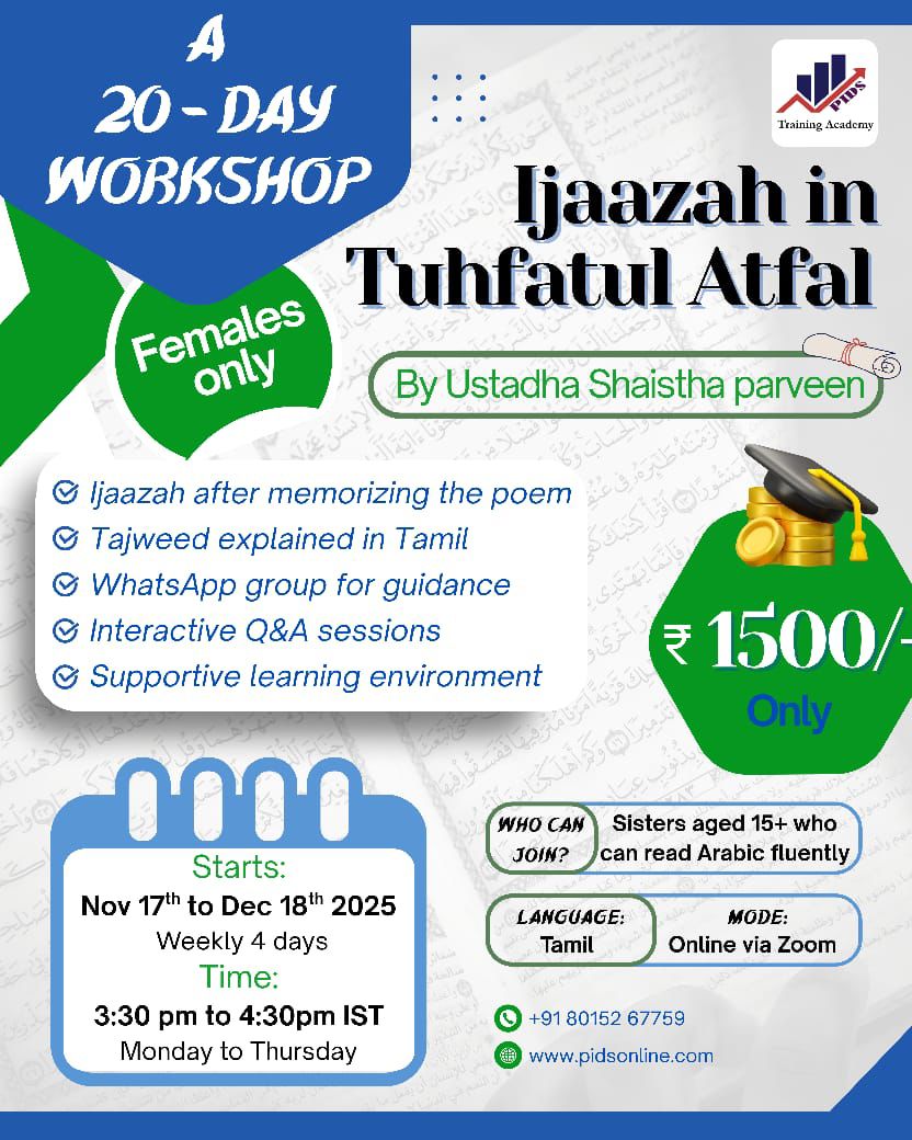 This exclusive 20-day online course for females is designed to help learners perfect Quran recitation with proper Tajweed, memorize the famous poem Tuhfatul Atfal, and gain certification upon completion.