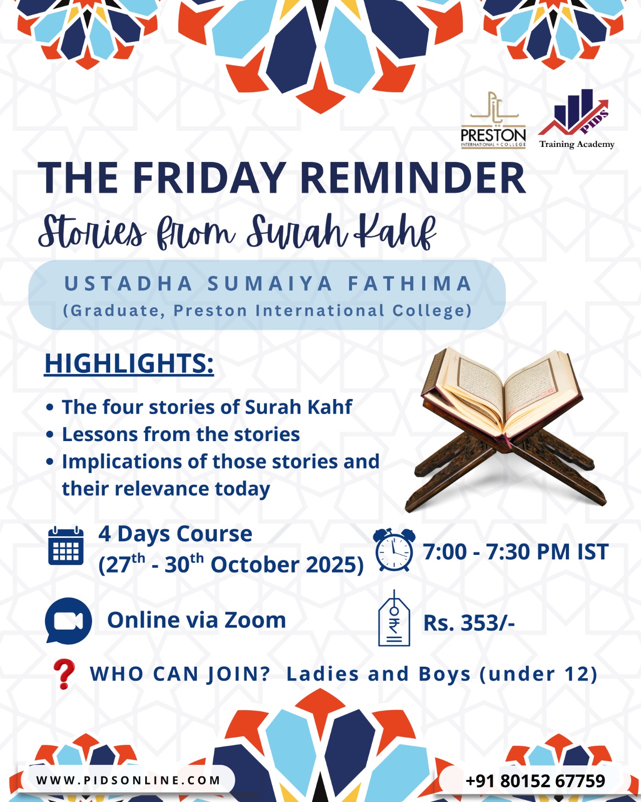 Gain timeless wisdom from the Qurβan through the Stories from Surah Kahf β a 4-day online course designed to inspire reflection, strengthen faith, and help us apply the lessons of Surah Kahf in our daily lives.